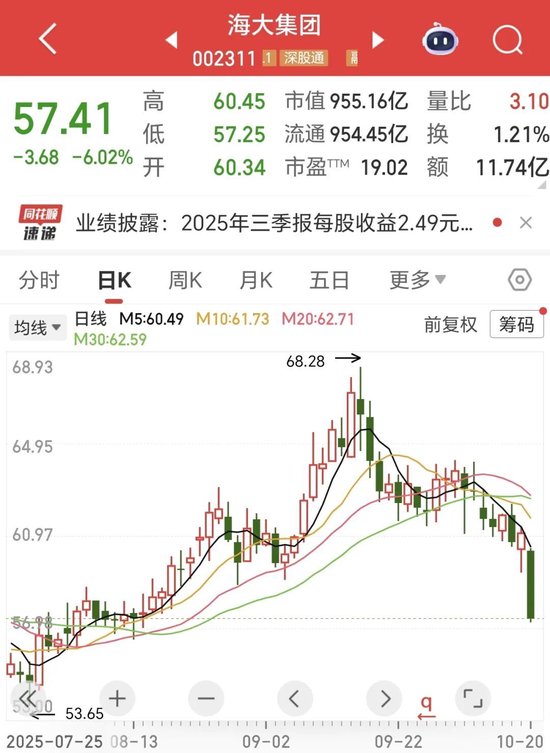 资本市场表现方面,截至10月20日收盘,海大集团股价报57.41元/股,跌幅达6.02%,对应市值955.16亿元。经营业绩上,2025年前三季度公司实现营业收入955.16亿元,同比增长13.24%;归属于上市公司股东的净利润41.42亿元,同比增长14.31%,整体保持稳健增长态势。